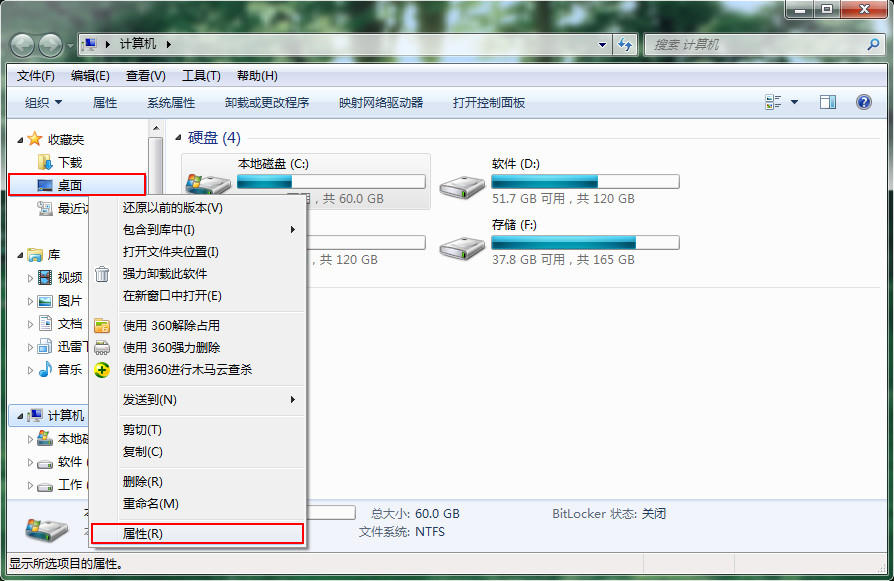 2、鼠標右鍵單擊“桌面”選項,然后從菜單欄中選取“屬性”項,如圖所示: