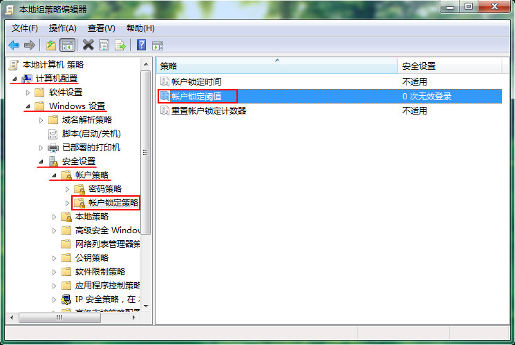 3、打開本地組策略編輯器,依次展開“計(jì)算機(jī)配置——Windows設(shè)置——安全設(shè)置——賬戶策略——賬戶鎖定策略”文件夾,接著在右側(cè)找到并雙擊“賬戶鎖定閥值”項(xiàng),如圖所示: